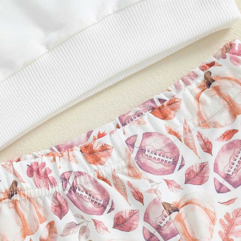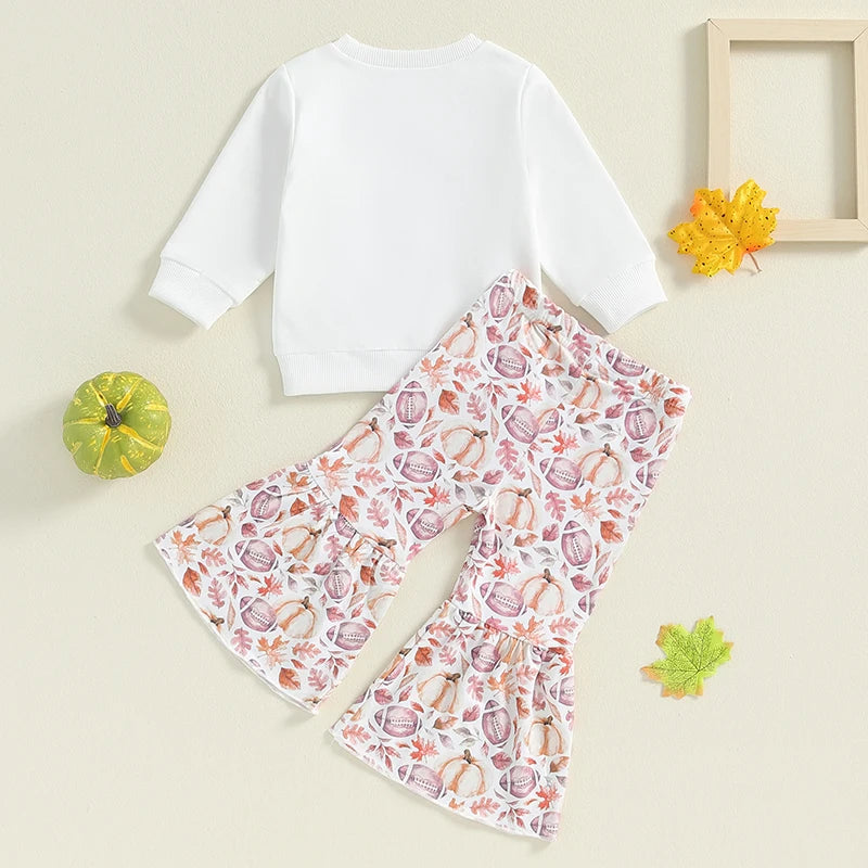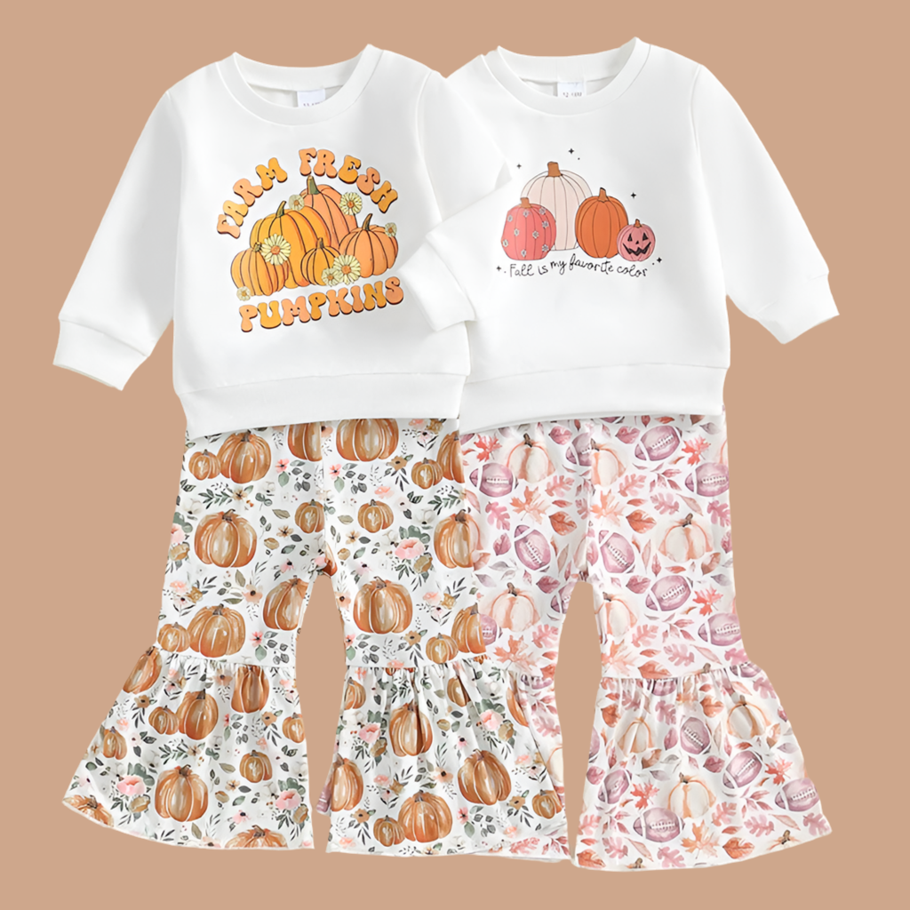 "Get ready to fall in love with Polly Pumpkin Patch! This adorable fall outfit features stylish flare pants for a cute and trendy look. Perfect for any little girl who wants to stand out in the pumpkin patch. (Pun intended!) Add some flair to your fall wardrobe with Polly Pumpkin Patch."