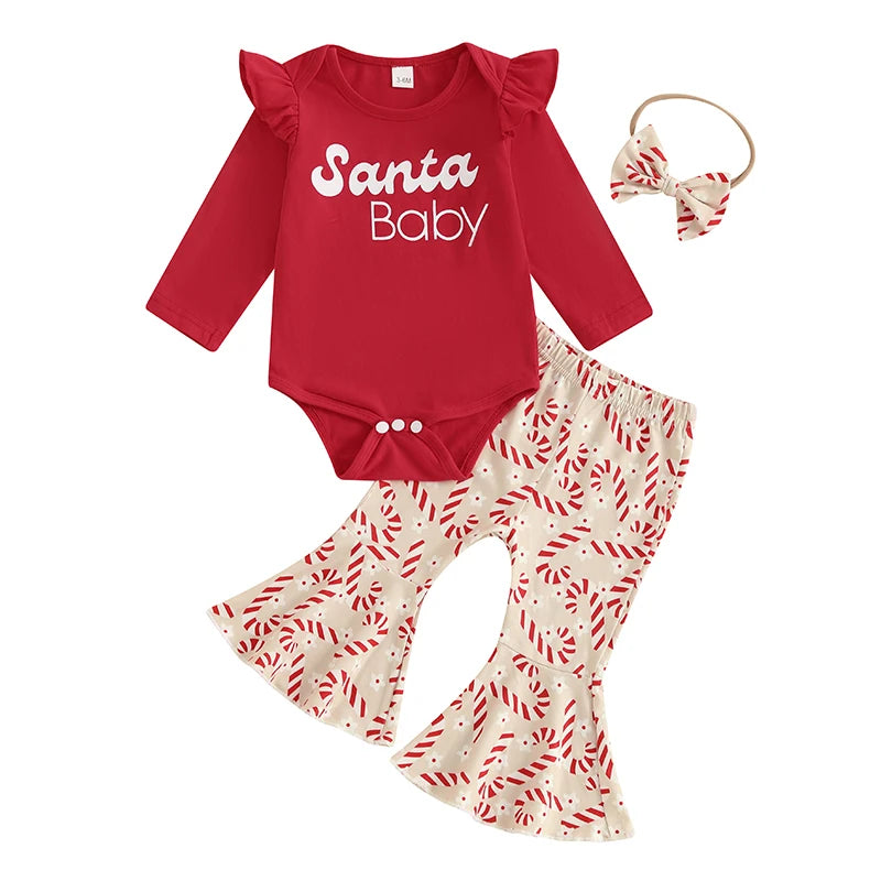 Santa Baby Flare outfit raises holiday fun with a "santa baby" top and playful candy cane pants, complete with a bow. 'Tis the season to be jolly and fashionable!