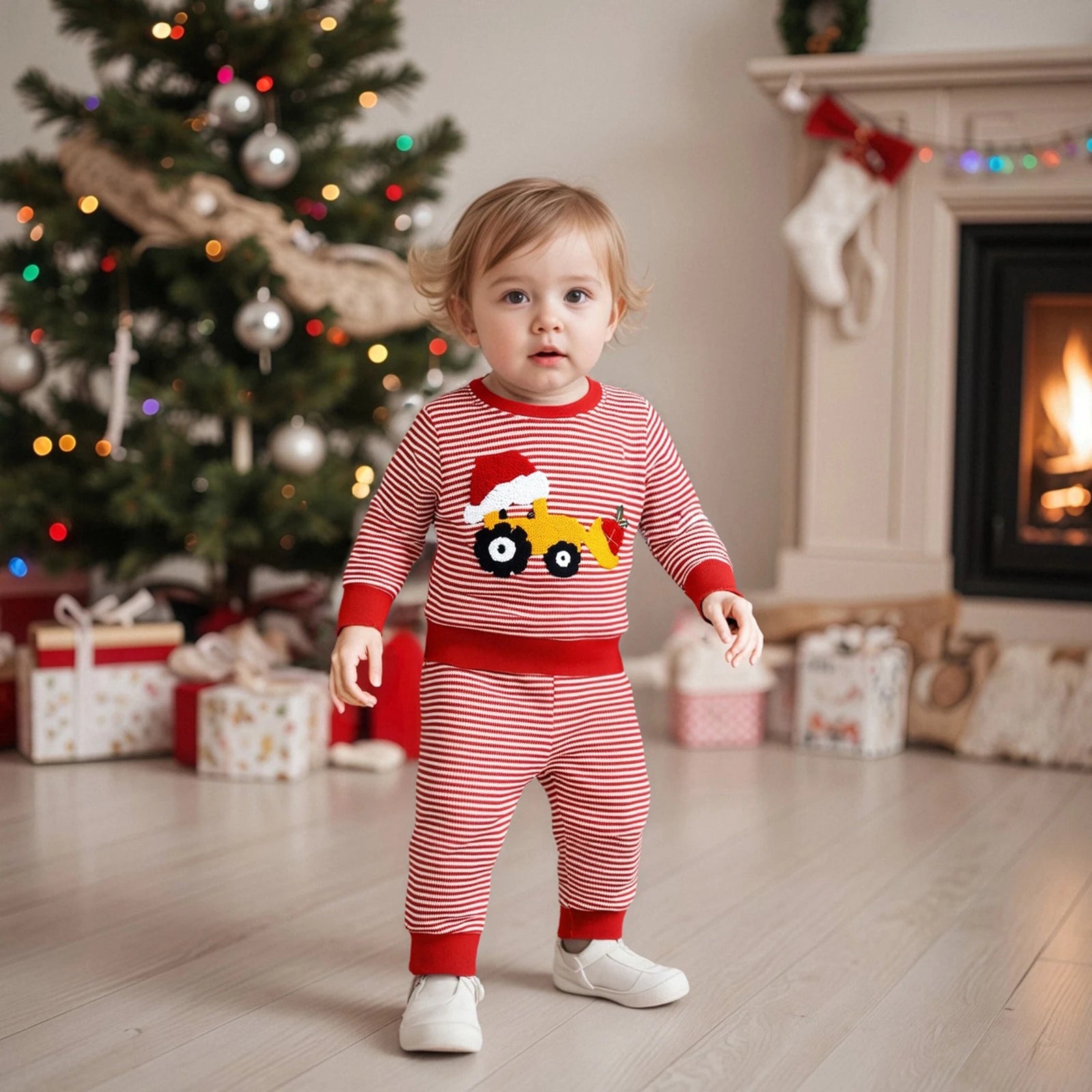 • A festive holiday outfit set that combines classic stripes with playful tractor embroidery, making it a delightful gift for baby and toddler boys.