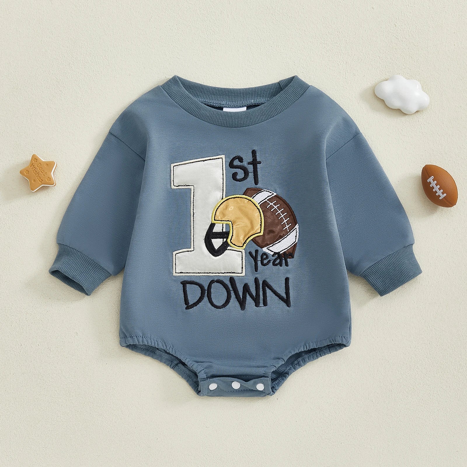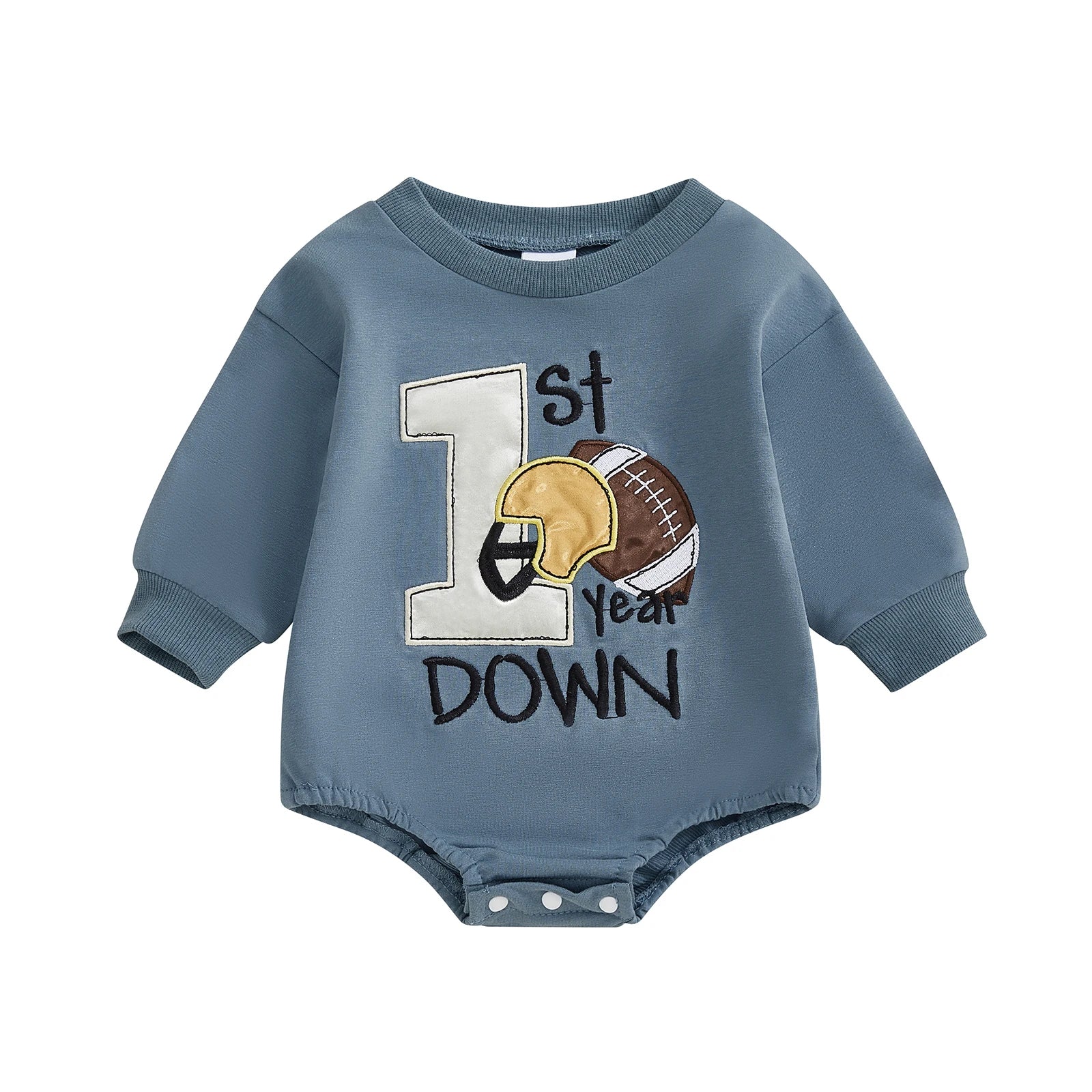 • Baby boy long sleeve romper with “1st Year Down” football and helmet embroidery – perfect for celebrating your little MVP’s first year.