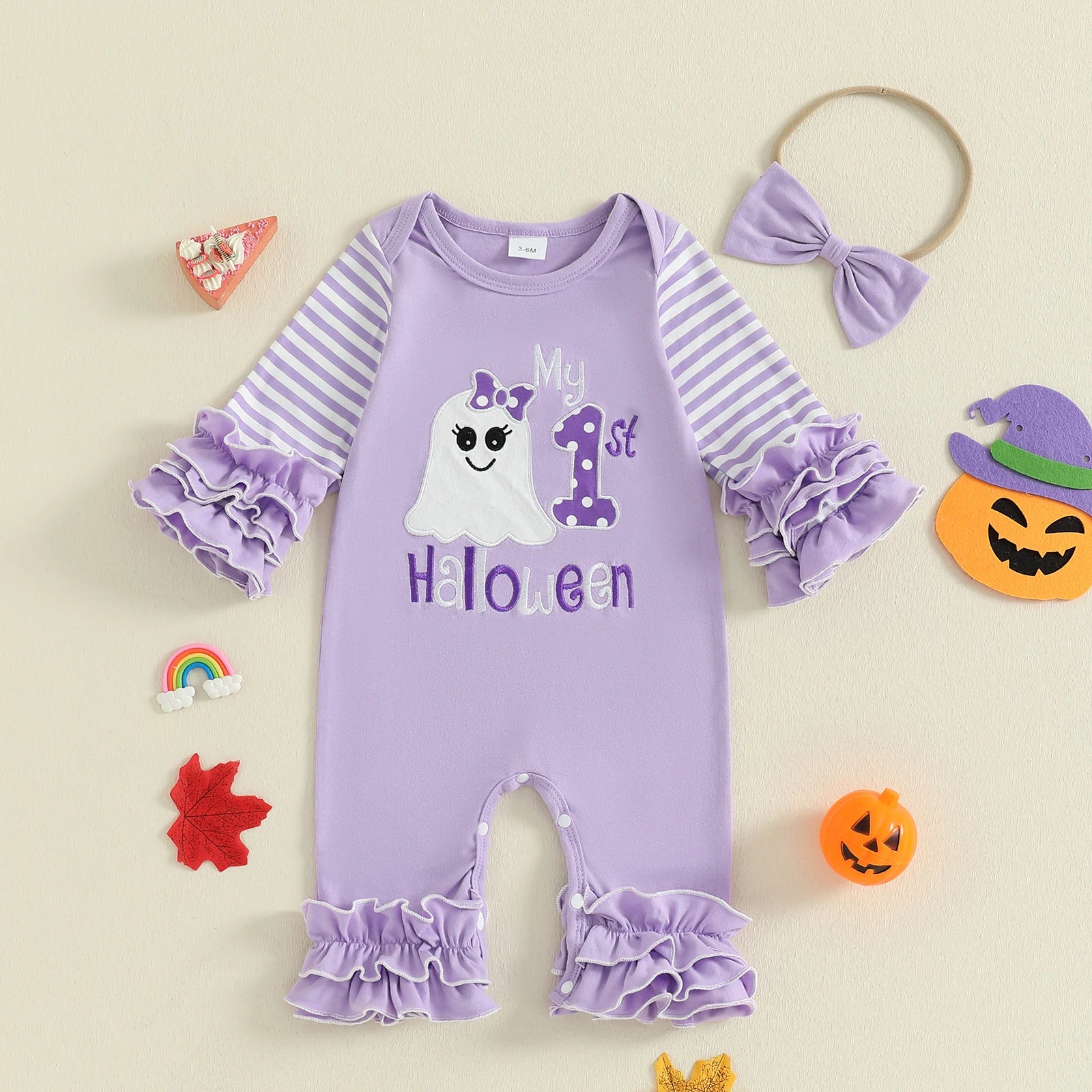Baby Girl Halloween Outfit Set – Pumpkin & Ghost Embroidery Ruffle Romper with Striped Sleeves + Headband – Infant Toddler Fall Clothes