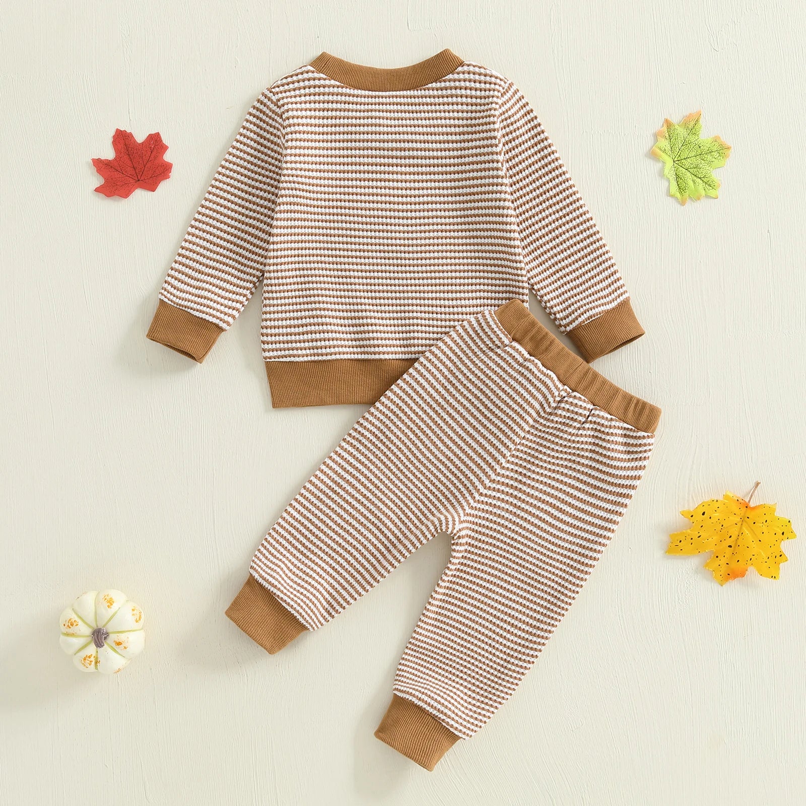 This infant turkey-themed Thanksgiving set combines holiday charm with everyday comfort. The striped long sleeve top with colorful turkey embroidery pairs perfectly with matching pants for a cute, coordinated look. Great for family photos, festive gatherings, or cozy fall playdates, this set is designed to keep your little one stylish and comfortable all season.