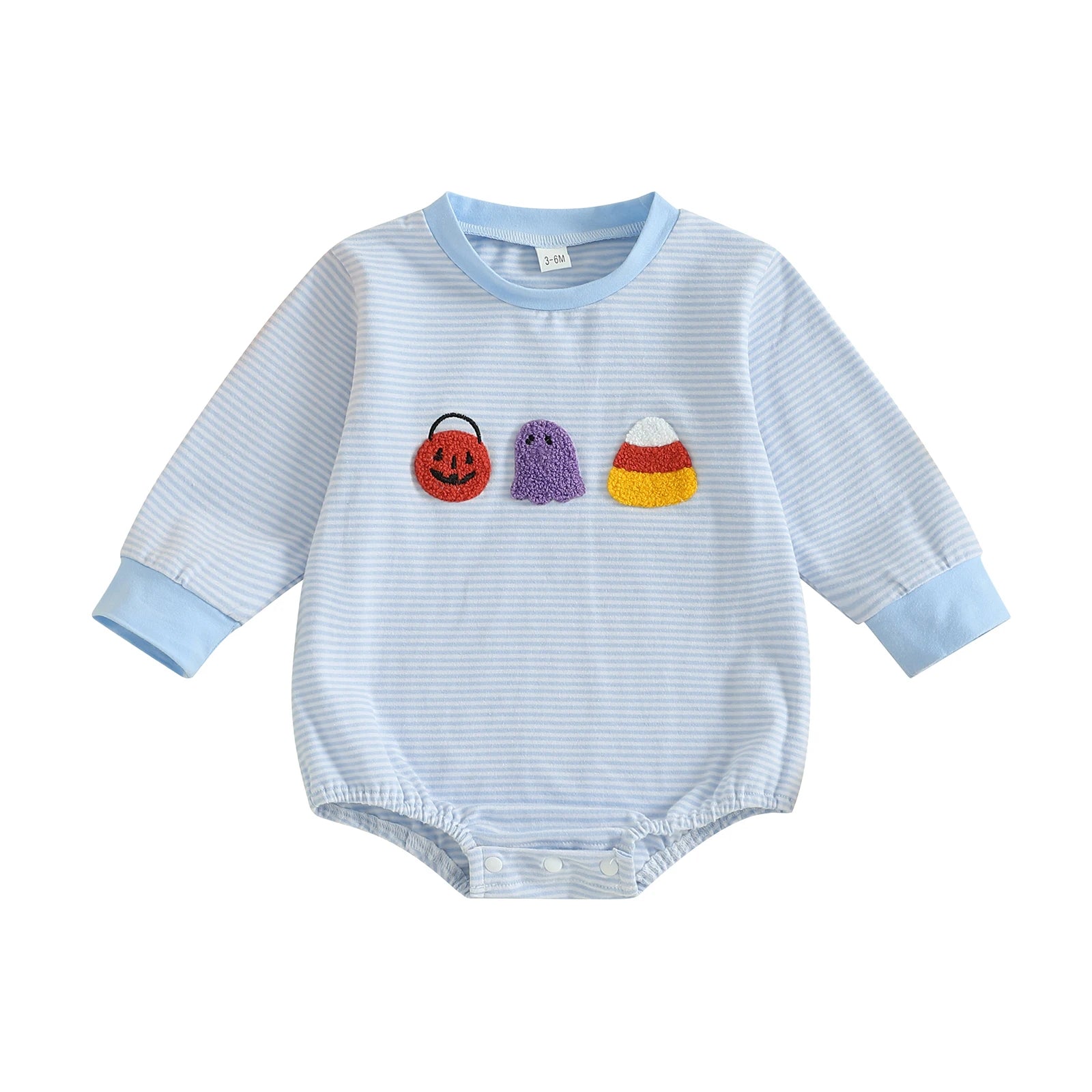 • Long-sleeve romper with adorable Halloween-themed embroidery (pumpkin bucket, ghost, candy corn) on a soft blue-and-white striped background – perfect for baby girls and boys.